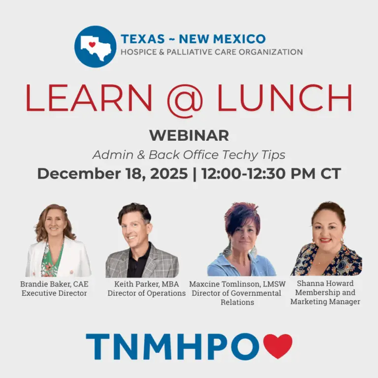 A TNMHPO Membership Plus Education Subscription gives members of the Texas New Mexico Hospice & Palliative Care Organization unlimited access to all archived online education for the entire year.  You can provide training to your current staff and utilize these educational opportunities for new employee orientation.  There are courses for every discipline on your hospice team and continuing education units and proof of attendance for Administrators, Nurses, Social Workers, and LPCs.
